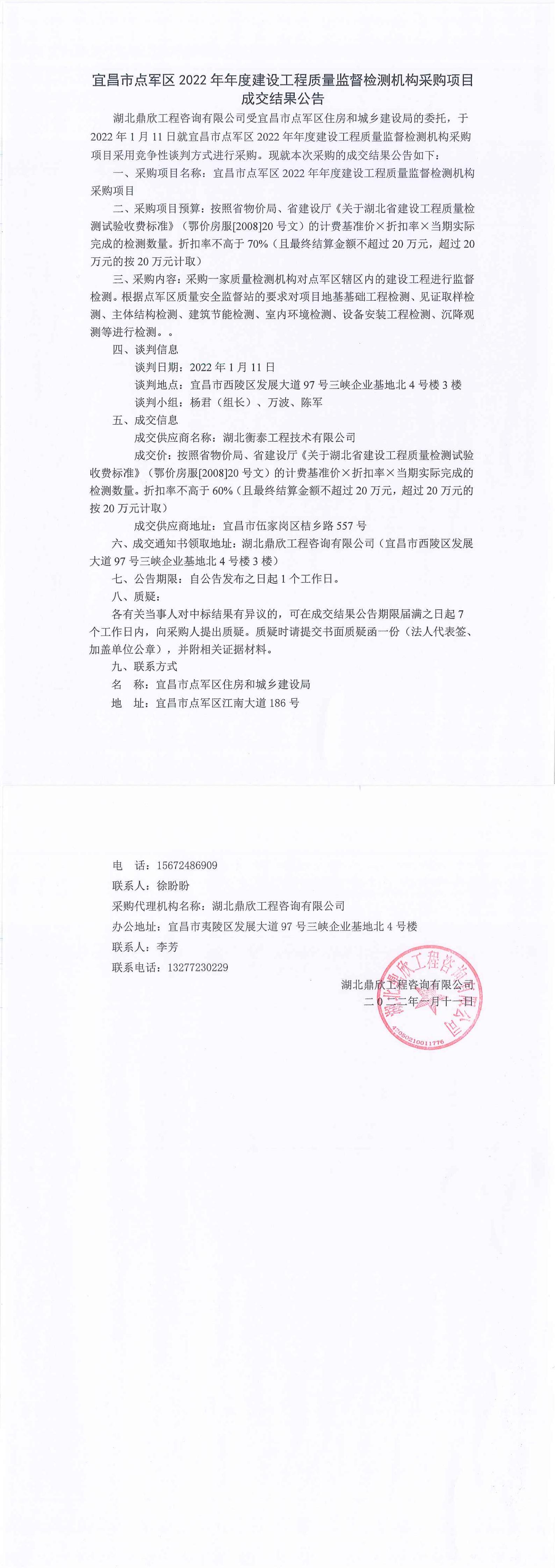 宜昌市點(diǎn)軍區(qū)2022年年度建設(shè)工程質(zhì)量監(jiān)督檢測(cè)機(jī)構(gòu)采購(gòu)項(xiàng)目成交公告