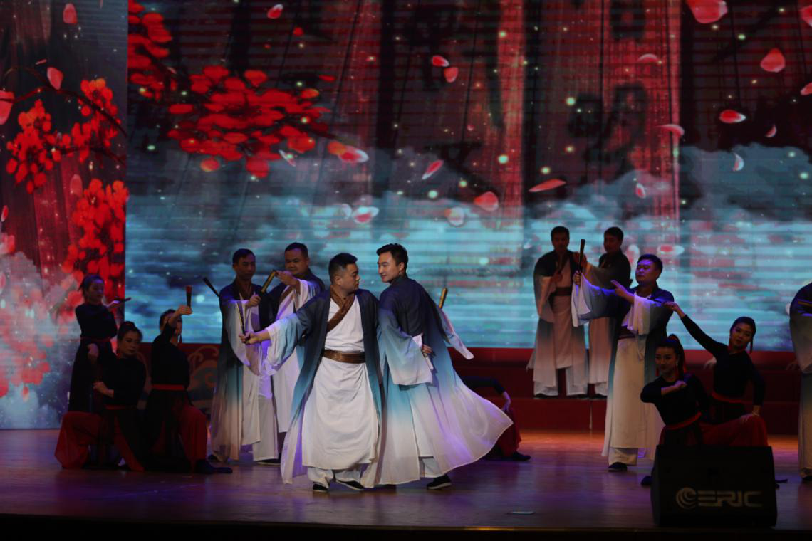隨著音樂響起,“楚國男子”白衣飄飄,手持紙扇,“江南女子”搖曳身姿,執(zhí)扇起舞。公司參加表演的職工在舞臺(tái)上大放異彩,為現(xiàn)場和觀看直播的觀眾奉上一場美輪美奐的文化盛宴,既再現(xiàn)了楚國藝術(shù)的奇異想象和浪漫色彩,也展現(xiàn)了江南點(diǎn)軍的神秘風(fēng)情和深遠(yuǎn)文化。