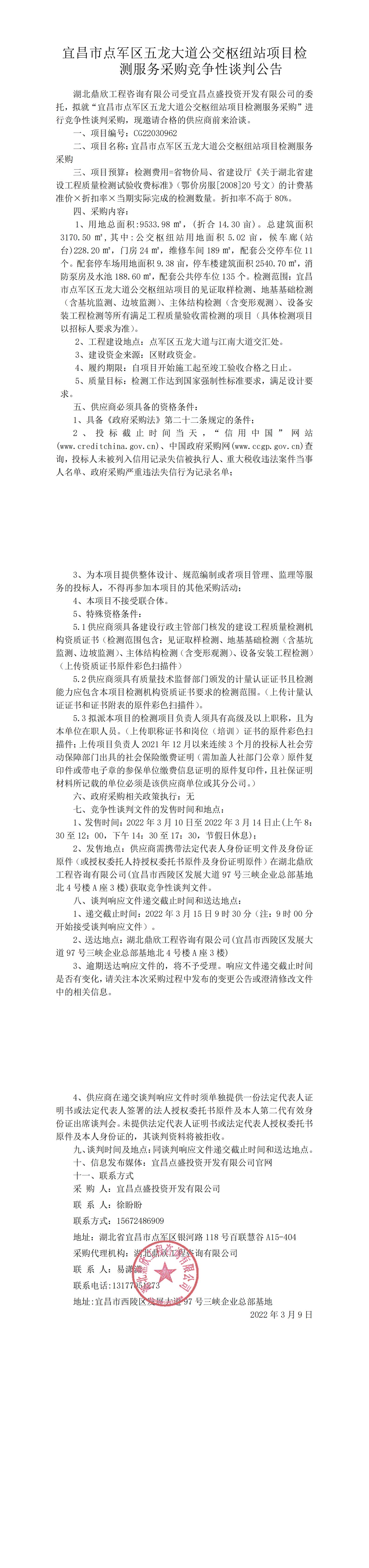 宜昌市點(diǎn)軍區(qū)五龍大道公交樞紐站項(xiàng)目檢測(cè)服務(wù)采購(gòu)競(jìng)爭(zhēng)性談判公告