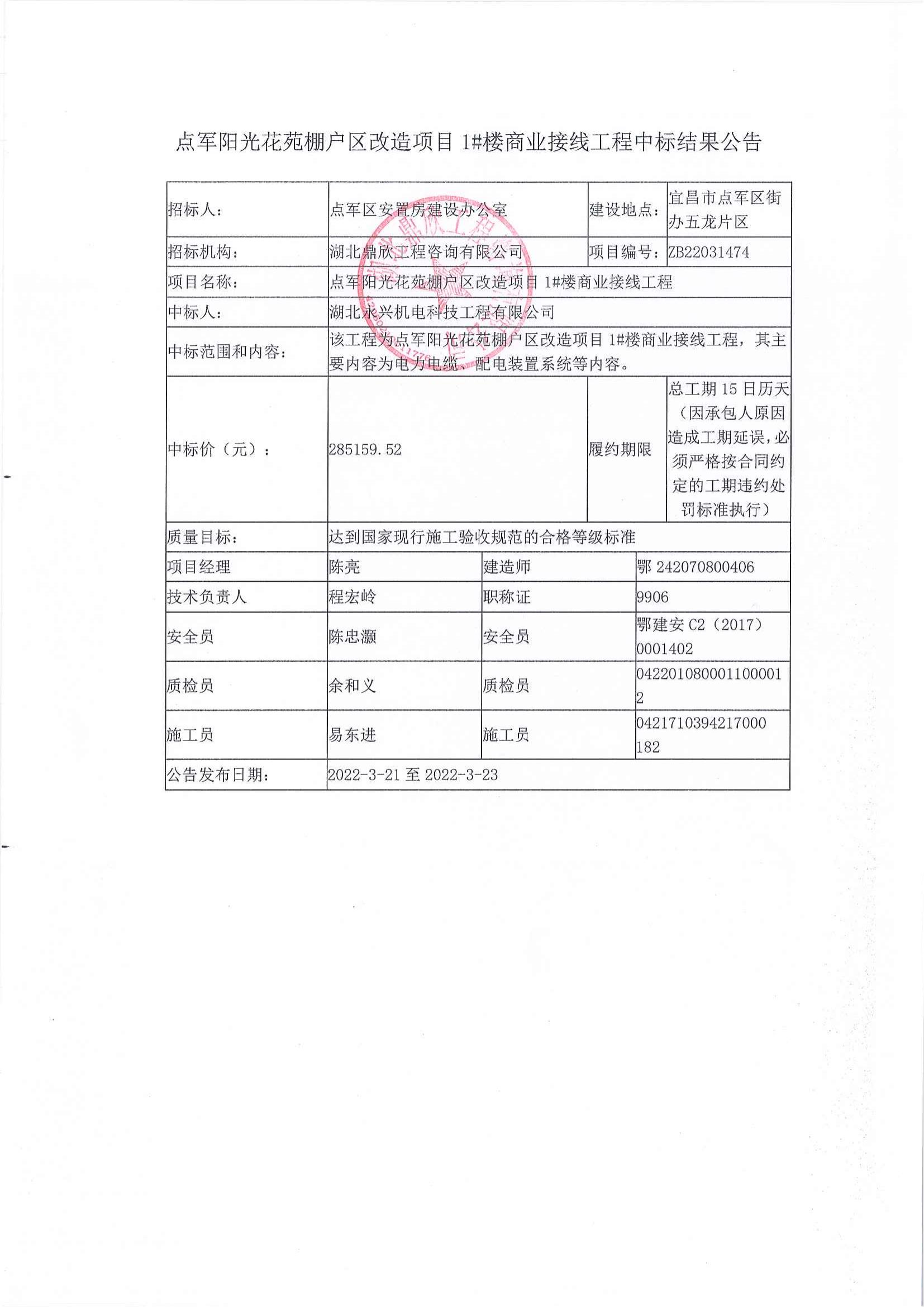點軍陽光花苑棚戶區(qū)改造項目1#樓商業(yè)接線工程中標(biāo)公告