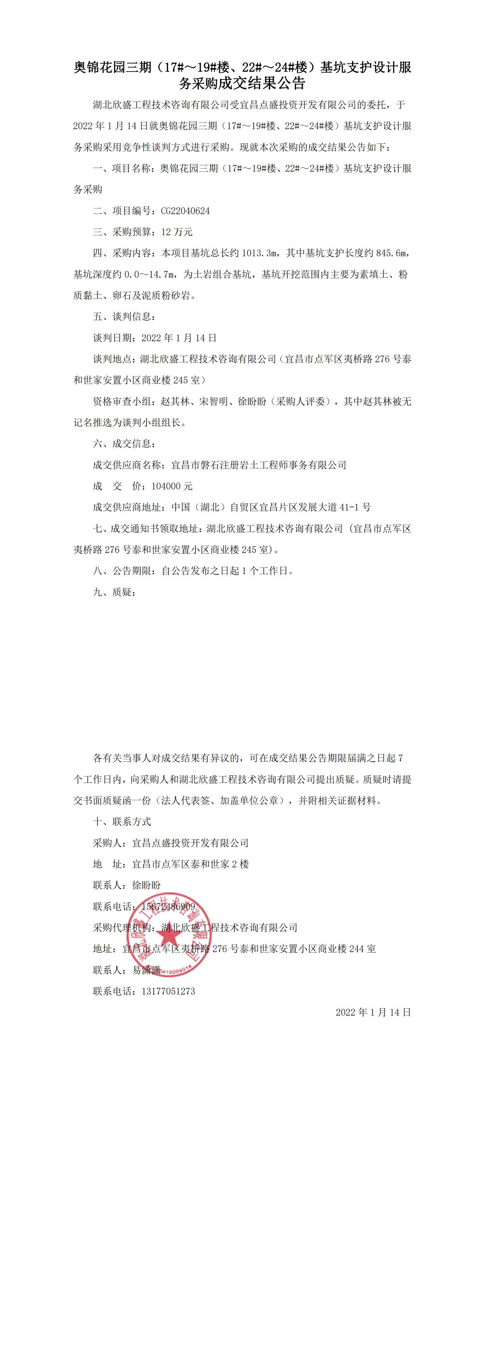奧錦花園三期(17#~19#樓、22#~24#樓)基坑支護(hù)設(shè)計(jì)服務(wù)采購(gòu)成交結(jié)果公告