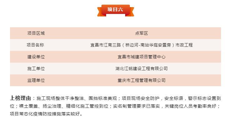 (通訊員:徐文剛、吳鵬翔)為進(jìn)一步貫徹落實《宜昌市揚塵污染防治條例》《宜昌市城區(qū)建設(shè)工程文明施工管理紅黑榜制度(試行)》,強(qiáng)化建筑工地文明施工管理,壓實建設(shè)單位文明施工主體責(zé)任,鼓勵文明施工先進(jìn)典型,打擊和曝光不文明施工違法行為,結(jié)合建筑工地實名制管理、關(guān)鍵崗位人員到崗履職相關(guān)要求,宜昌市住建局組織評選了2022年第七期建筑工程安全文明施工管理“紅黑榜”。點盛投資開發(fā)有限公司代建項目江南三路,成為點軍區(qū)唯一獲評紅榜的市政項目。