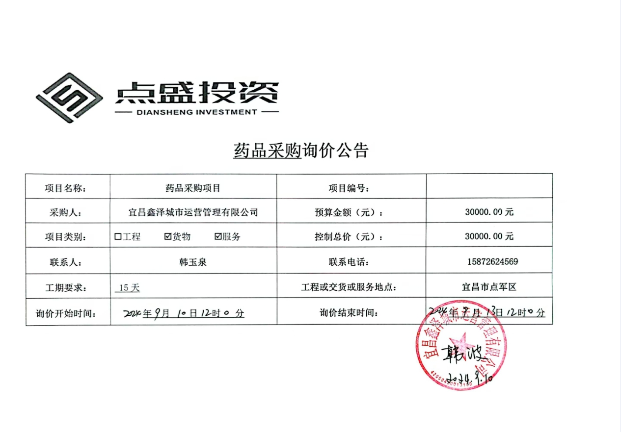 宜昌鑫澤城市運(yùn)營管理有限公司藥品采購項(xiàng)目詢價公告