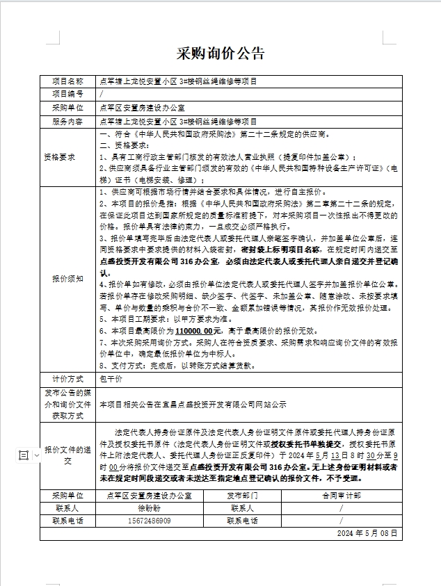 點(diǎn)軍塘上龍悅安置小區(qū)3#樓鋼絲繩維修等項(xiàng)目詢價(jià)公告