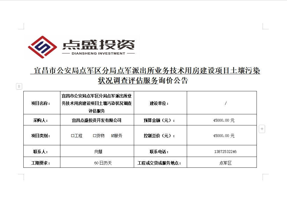 宜昌市公安局點軍區(qū)分局點軍派出所業(yè)務技術用房建設項目土壤污染狀況調(diào)查評估服務詢價公告