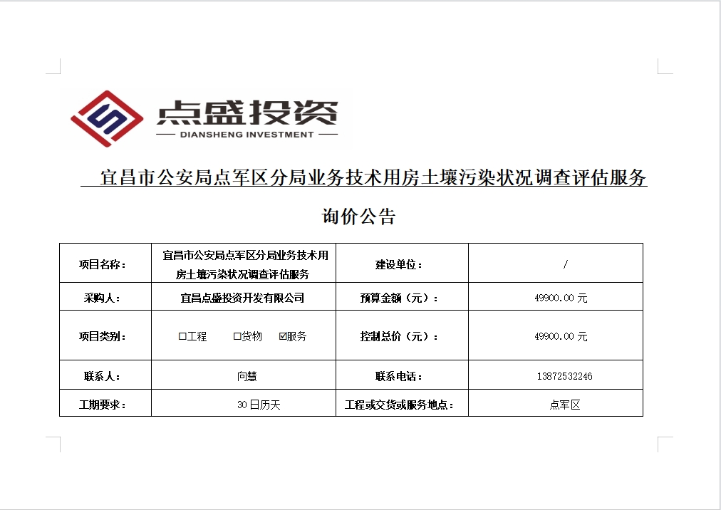 宜昌市公安局點(diǎn)軍區(qū)分局業(yè)務(wù)技術(shù)用房土壤污染狀況調(diào)查評(píng)估服務(wù)詢(xún)價(jià)公告