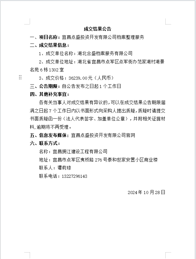 宜昌點盛投資開發(fā)有限公司檔案整理服務成交公告