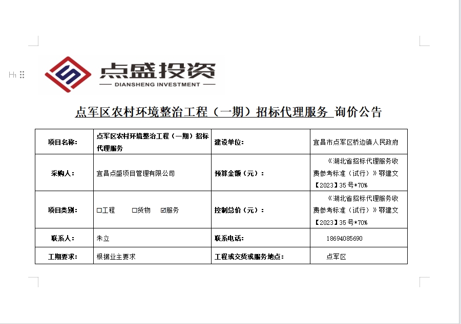 點軍區(qū)農(nóng)村環(huán)境整治工程(一期)招標(biāo)代理服務(wù)詢價公告