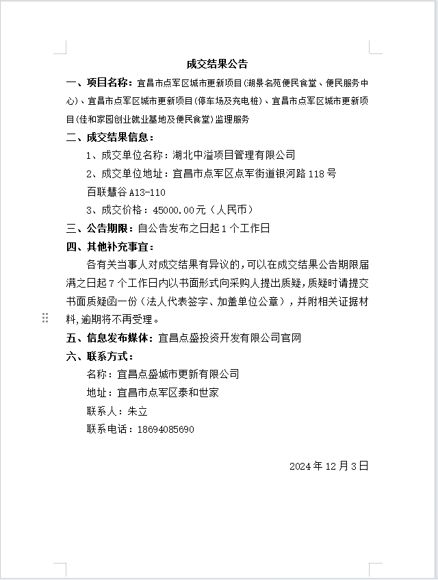 宜昌市點軍區(qū)城市更新項目(湖景名苑便民食堂、便民服務中心)、宜昌市點軍區(qū)城市更新項目(停車場及充電樁)、宜昌市點軍區(qū)城市更新項目(佳和家園創(chuàng)業(yè)就業(yè)基地及便民食堂)監(jiān)理服務成交公告