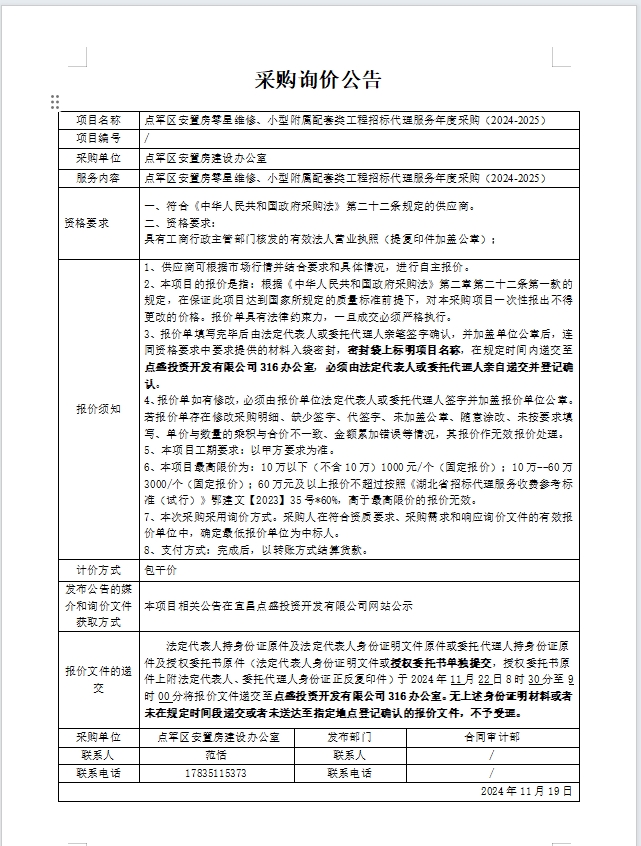 點(diǎn)軍區(qū)安置房零星維修、小型附屬配套類(lèi)工程招標(biāo)代理服務(wù)年度采購(gòu)(2024-2025)詢(xún)價(jià)公告