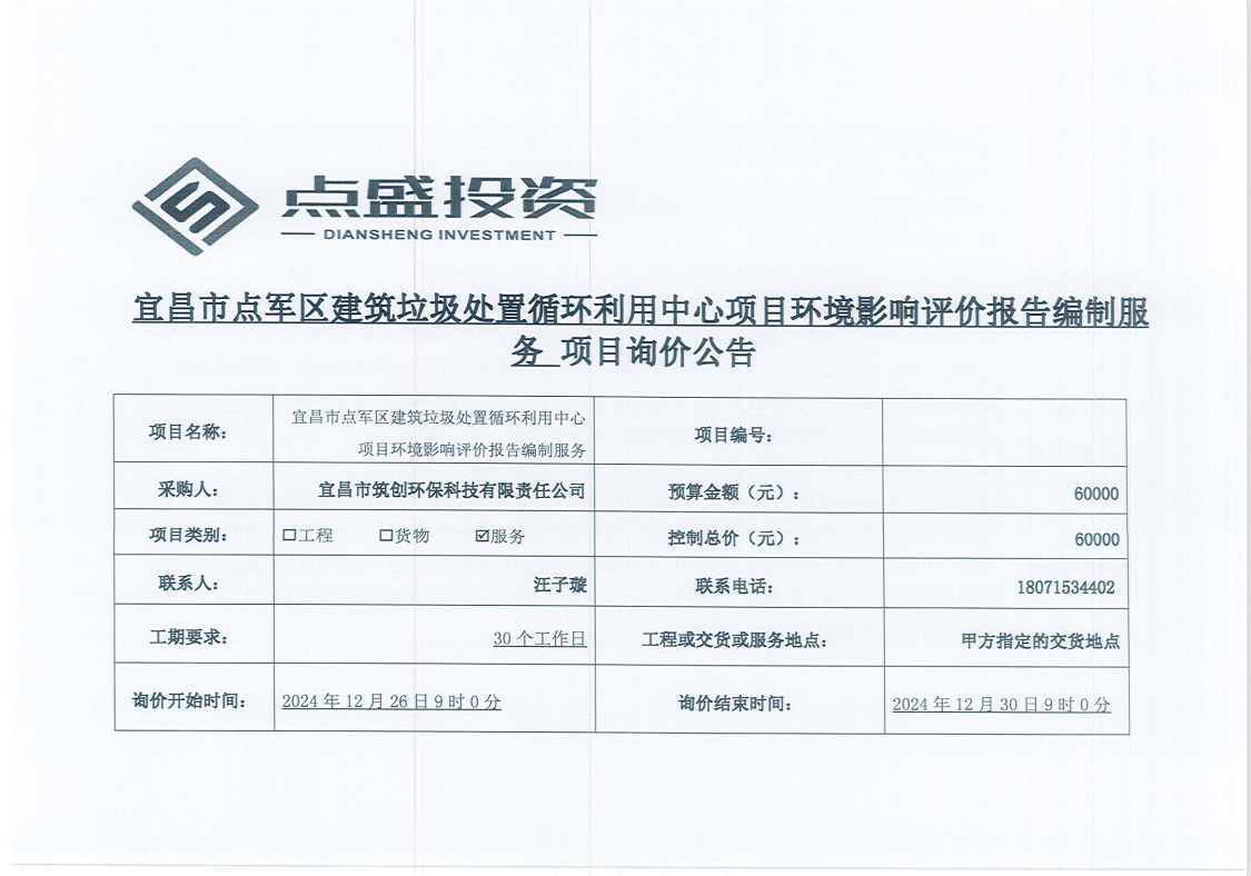 宜昌市點軍區(qū)建筑垃圾處置循環(huán)利用中心項目環(huán)境影響評價報告編制服務(wù)項目詢價公告