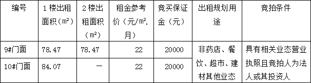 上述第9號(hào)門(mén)面房整體出租1至2樓,10#門(mén)面房只出租一樓。目前,上述門(mén)面房均處于空置的毛坯狀態(tài),現(xiàn)狀分別對(duì)外出租。相關(guān)競(jìng)買(mǎi)事項(xiàng)詳見(jiàn)本公司拍賣資料中的《競(jìng)買(mǎi)協(xié)議》樣本特別說(shuō)明條款內(nèi)容,且標(biāo)的物自公告之日起至2021年12月10日17:00止,在標(biāo)的物現(xiàn)場(chǎng)展示(集中看房時(shí)間定于2021年12月10日8:30-12:00,14:00-17:00)。